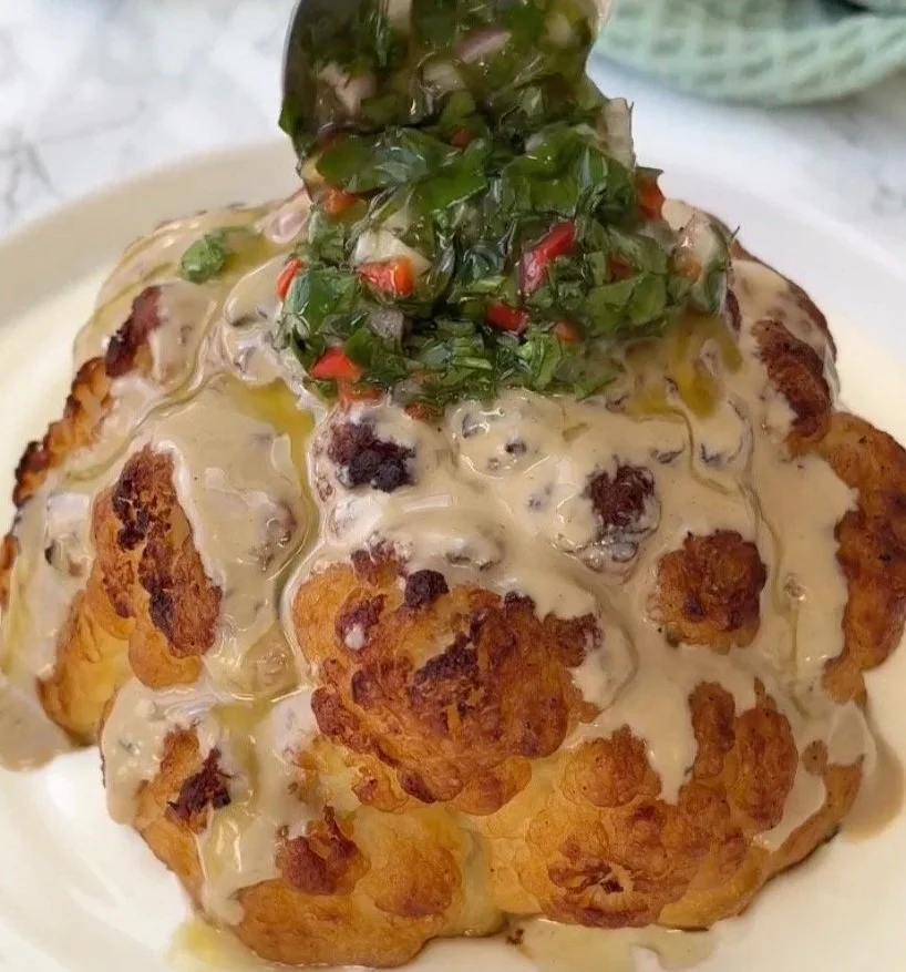 Spoon some garlicky yoghurt onto on a serving plate and pop the cauliflower on the top. Drizzle with tahini and the chimicurri.